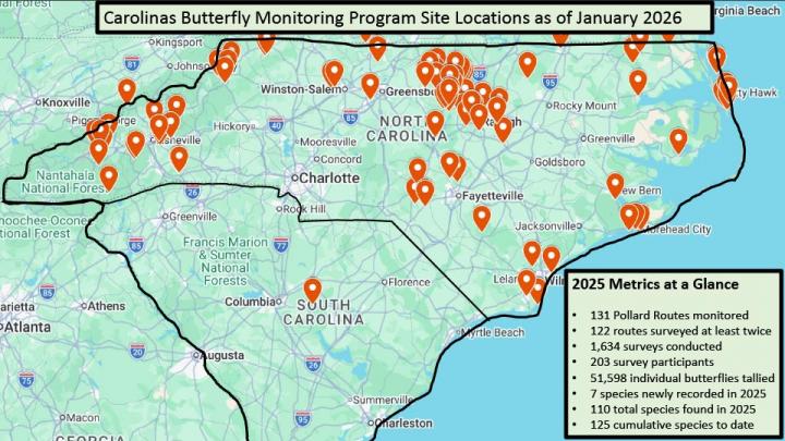 The Carolinas Butterfly Monitoring Program (CarolinasBMP) tracks butterfly populations using modified Pollard Walk protocols, inventory trips, and opportunistic sightings across both North and South Carolina. This Citizen Science based program partners with various non-profit and government organizations, offers public outreach, encourages interaction between the general public and professional biologists, and provides data to researchers evaluating the health of habitats and insect populations in the Carolinas. While officially launched in 2023, some Pollard Walk surveys meeting protocol criteria and dating back to 2018 have been ingested.
