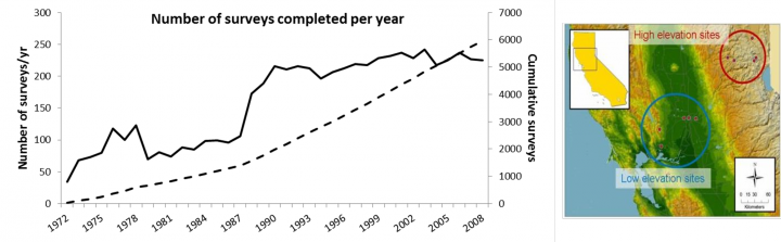 O'Brien, J. M., J. H. Thorne, M. L. Rosenzweig, and A. M. Shapiro. 2011. Once-yearly sampling for the detection of trends in biodiversity: The case of Willow Slough, California. Biological Conservation 144:2012-2019.